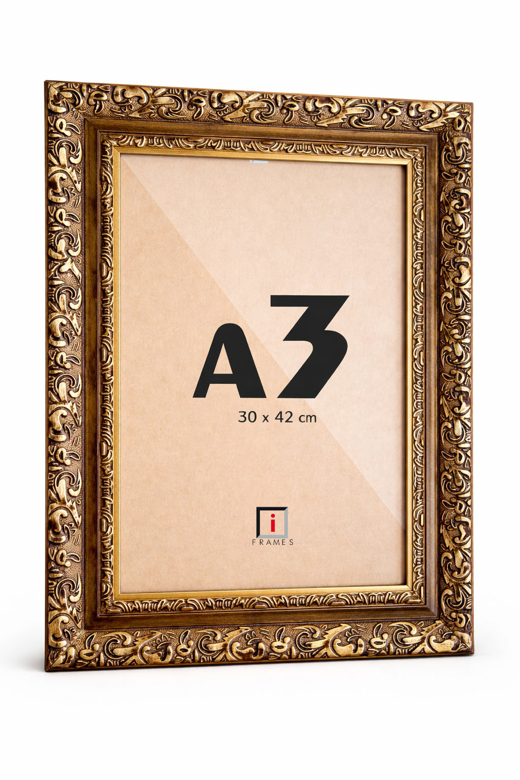 Moldura clássica em tom dourado envelhecido, com detalhes entalhados em alto relevo e acabamento refinado que remete ao estilo barroco.