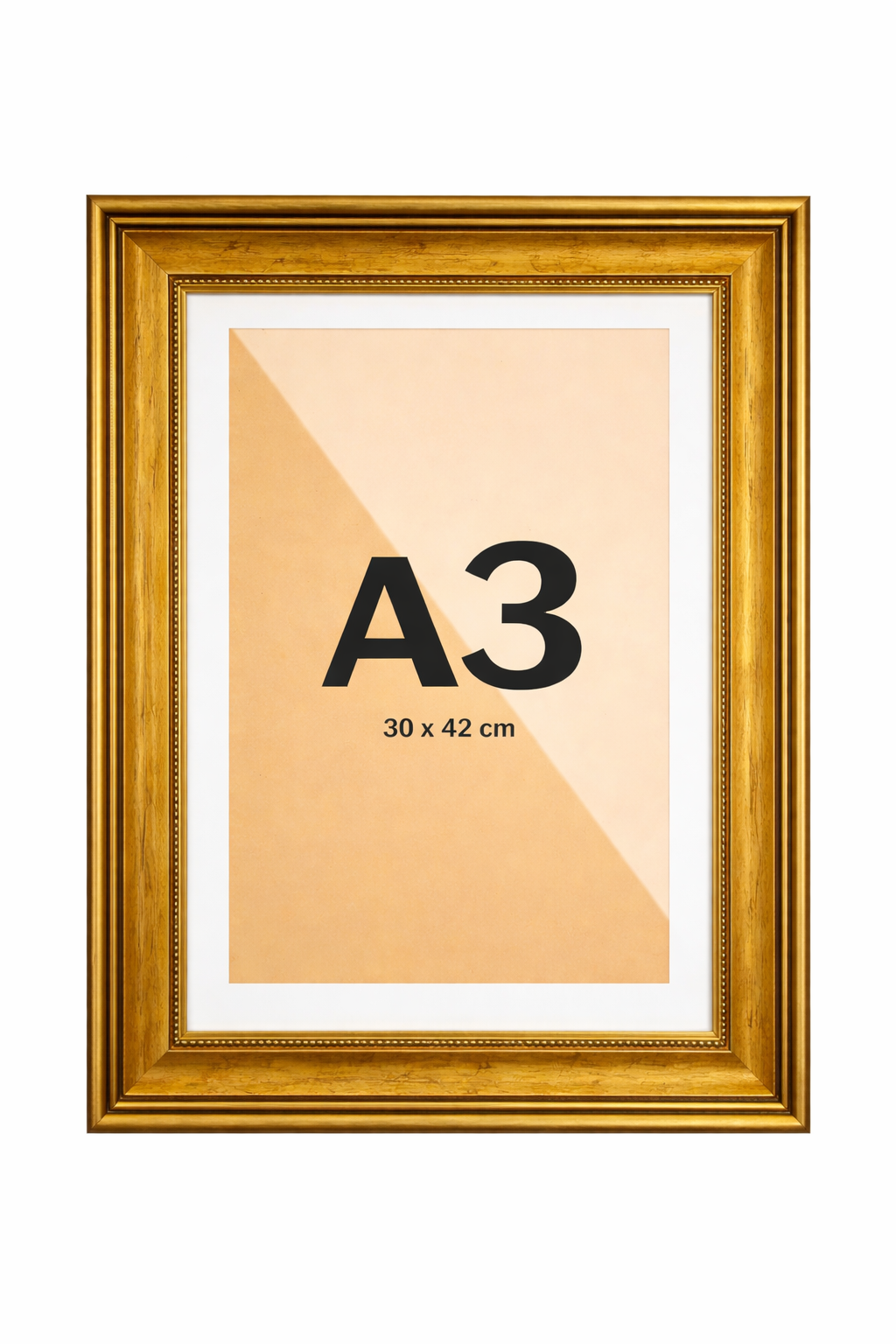 Moldura Império Dourado com acabamento clássico e detalhes refinados. Ideal para quadros, fotos e certificados em A3 30x42cm, valorizando qualquer ambiente com elegância e sofisticação.