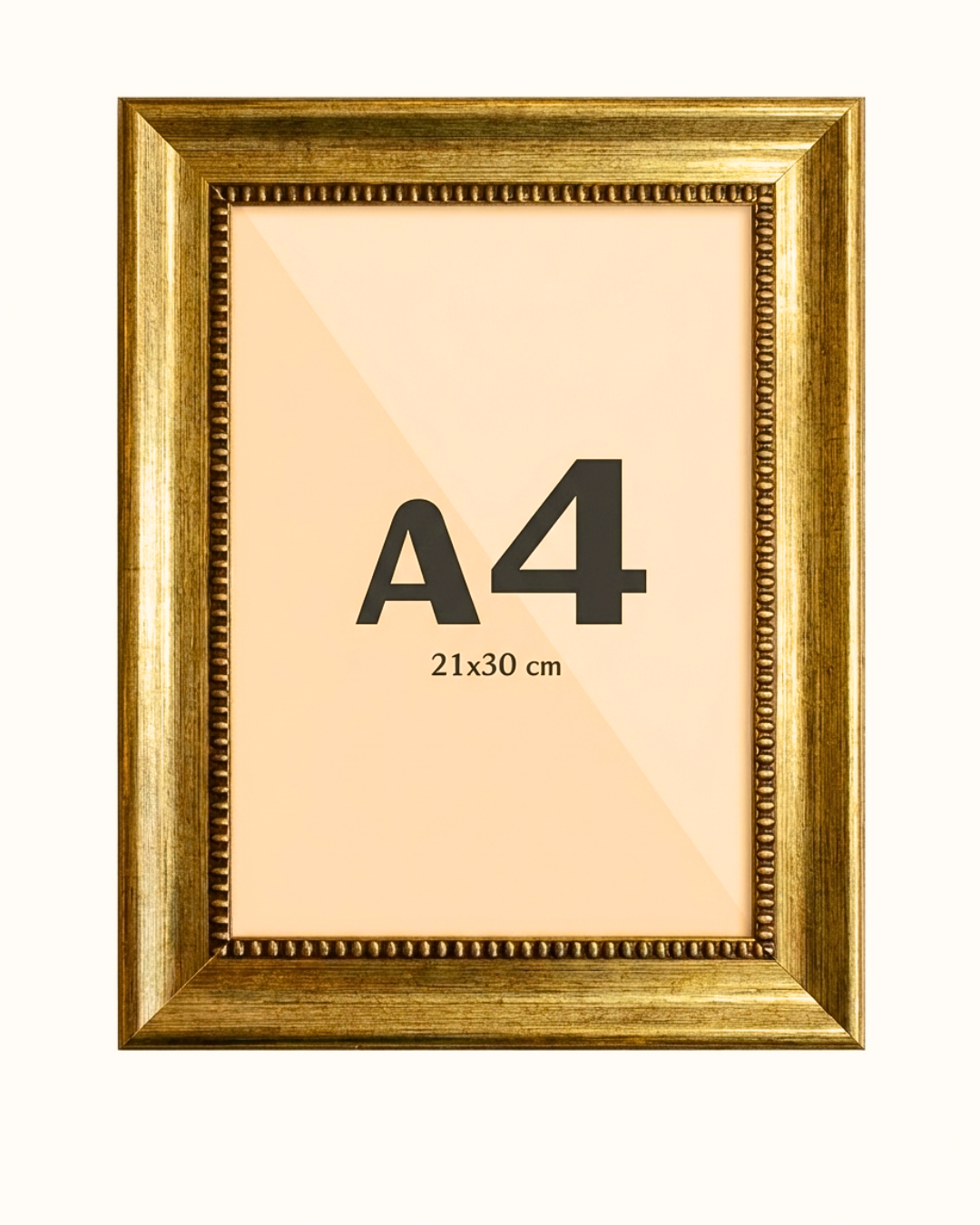 Moldura Aurum em dourado envelhecido, com acabamento clássico e detalhe interno sofisticado. Ideal para valorizar fotos, ilustrações e obras em tamanho A4 com elegância atemporal.