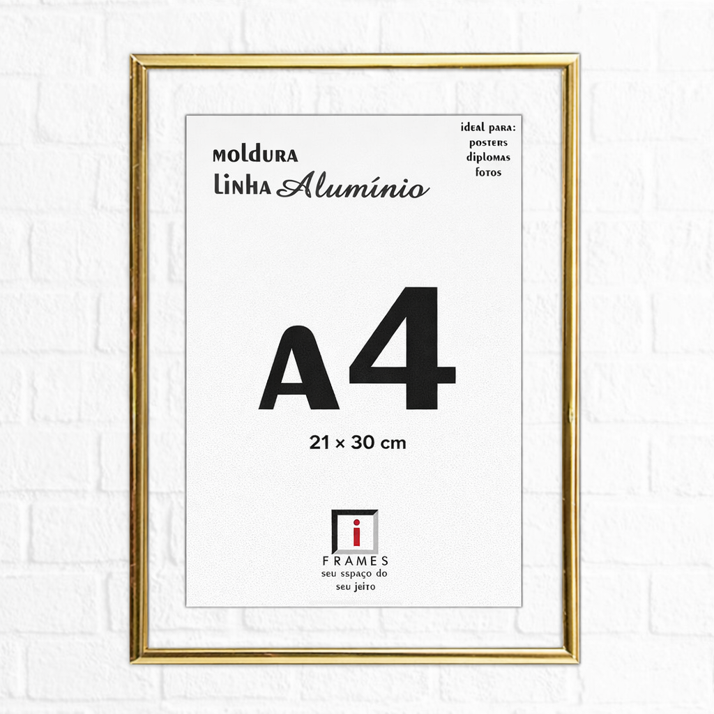 Material e Cor: Feita em alumínio de alta qualidade, a moldura possui um acabamento dourado que oferece leveza e durabilidade, combinando perfeitamente com qualquer ambiente.